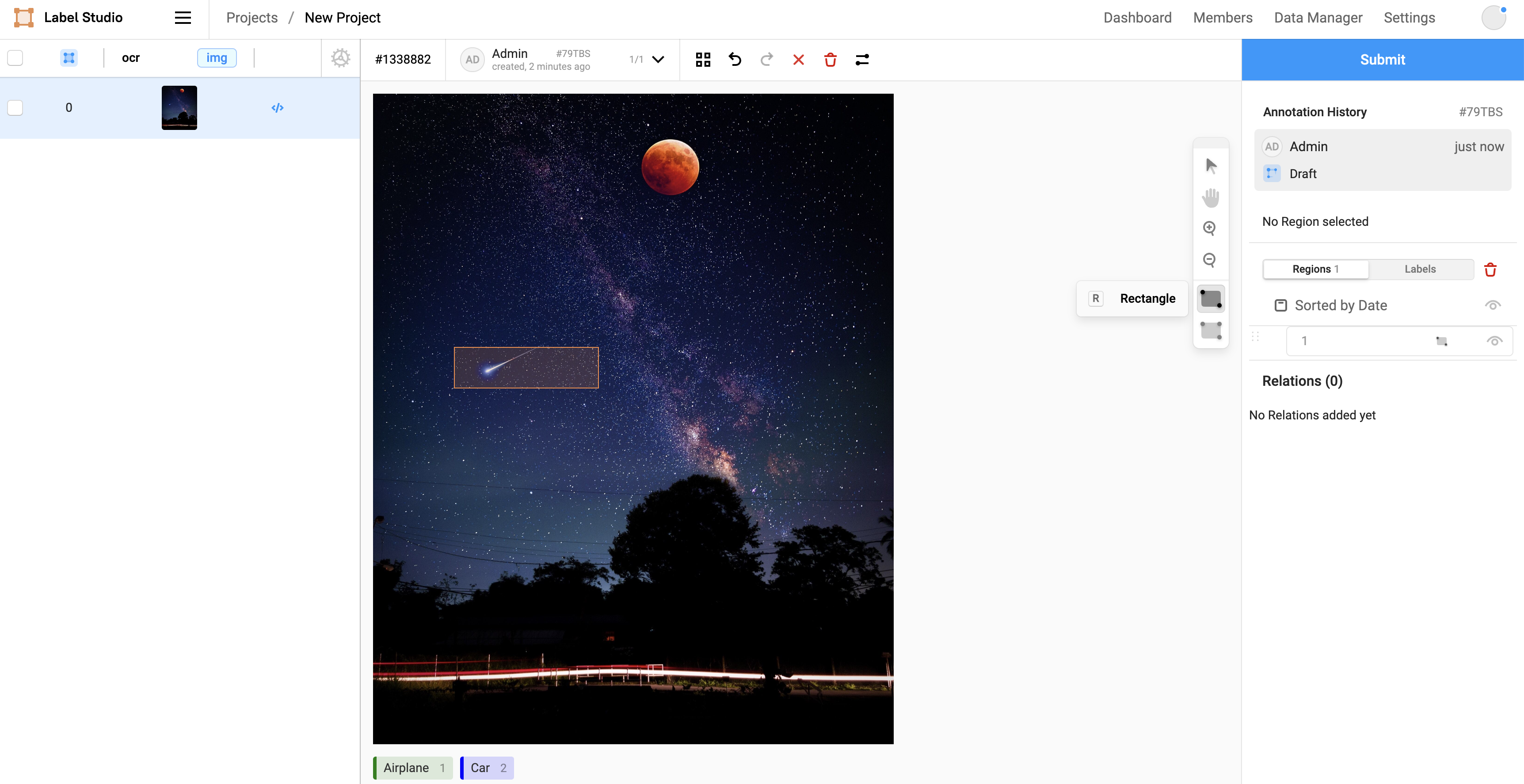 If you want to perform object detection, you need to create a labeled dataset. Use the following template to add rectangular bounding boxes to images, and label the contents of the bounding boxes.